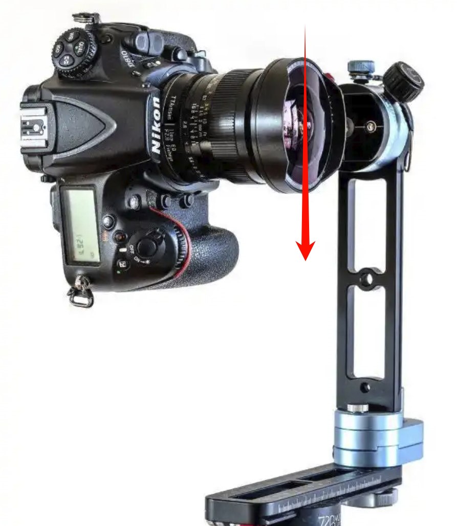 在我们进行盐城VR全景拍摄的过程中,除了部分要求不高的使用VR全景相机外,盐城专业的都是用专业相机,我们在使用专业相机的时候,必不可少的就是VR云台,在长时期用过VR云台的人我想都会遇到一个相当无语的问题:拍摄过程中会出现相像镜头向正下文下垂,如下图箭头方向下垂。